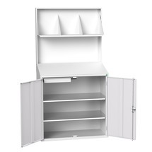 - Mit verschweißtem Stahlblechgehäuse mit schrägem Schreibpult, abschließbarem Schrank, einer verstärkten Tür, einem höheneinstellbaren Fachboden aus verzinktem Stahlblech (Tragfähigkeit: 35 kg), einer Ausziehwanne (Tragfähigkeit 10 kg) und einem Rückwandaufsatz