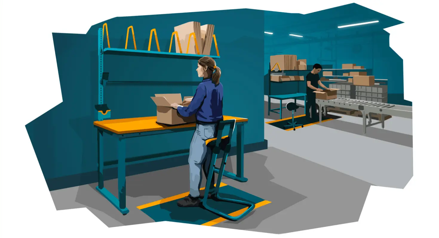 Wo im Stehen gearbeitet wird, schützen ergonomische Produkte den Körper und senken Fehlerquoten. Arbeitsplatzmatten reduzieren Druck und Ermüdung. Höhenverstellbare Packtische und Förderlösungen bringen Material in Reichweite und ermöglichen ergonomische Arbeitshöhen im Mehrschichtbetrieb. Persönliche Schutzausrüstung wie rutschhemmende, ergonomische Sicherheitsschuhe erhöht die Arbeitssicherheit. Ergebnis: konzentrierte Teams und stabile Prozesse.