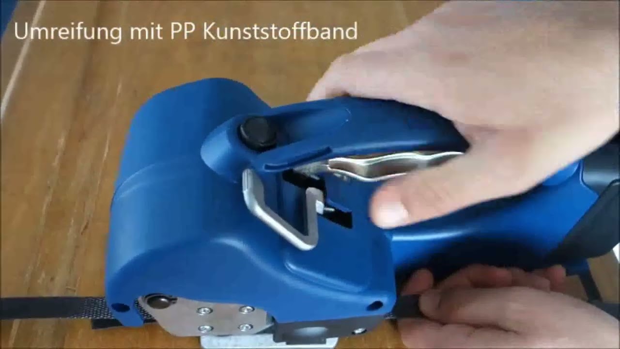 Das Akku-Umreifungsgerät BW verarbeitet PP-Kunststoffbänder und PET-Kunststoffbänder – ob horizontal oder vertikal. Die Bänder werden mittels Vibrationsschweißverfahren verbunden und ergeben somit einen sicheren Verschluss (ca. 75 % Verschlussfestigkeit). Spannkraft und Schweißzeit lassen sich über ein Display ganz einfach einstellen. Das Band muss im Duplex-Verfahren eingelegt werden, mittels Knopfdruck wird das Band gespannt und durch Umlegen eines Hebels wird der Verschluß erzeugt. Innerhalb weniger Sekunden ist eine sichere Umreifung hergestellt. Zum Lieferumfang gehört das Umreifungsgerät inkl. einer Batterie und einem Ladegerät.