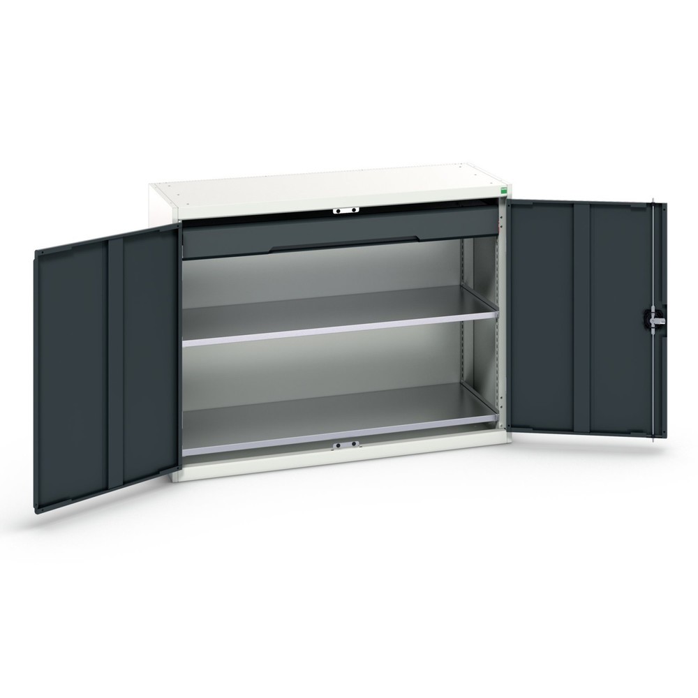 Der bott verso Beistellschrank mit Schublade besteht aus einem vollverschweißten Stahlblechgehäuse. Diese Konstruktion sorgt für eine hohe Standfestigkeit und lange Lebensdauer – selbst bei täglicher Beanspruchung. 2 verstärkte Türen schließen bündig und sichern den Innenraum zuverlässig.