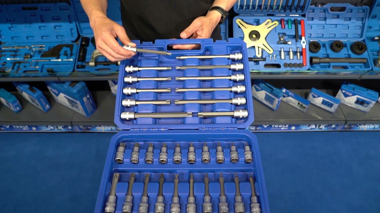 Die insgesamt 32 Torx-Bit-Stecknüsse haben Größen von T20 – T70. Die Oberfläche ist matt verchromt.