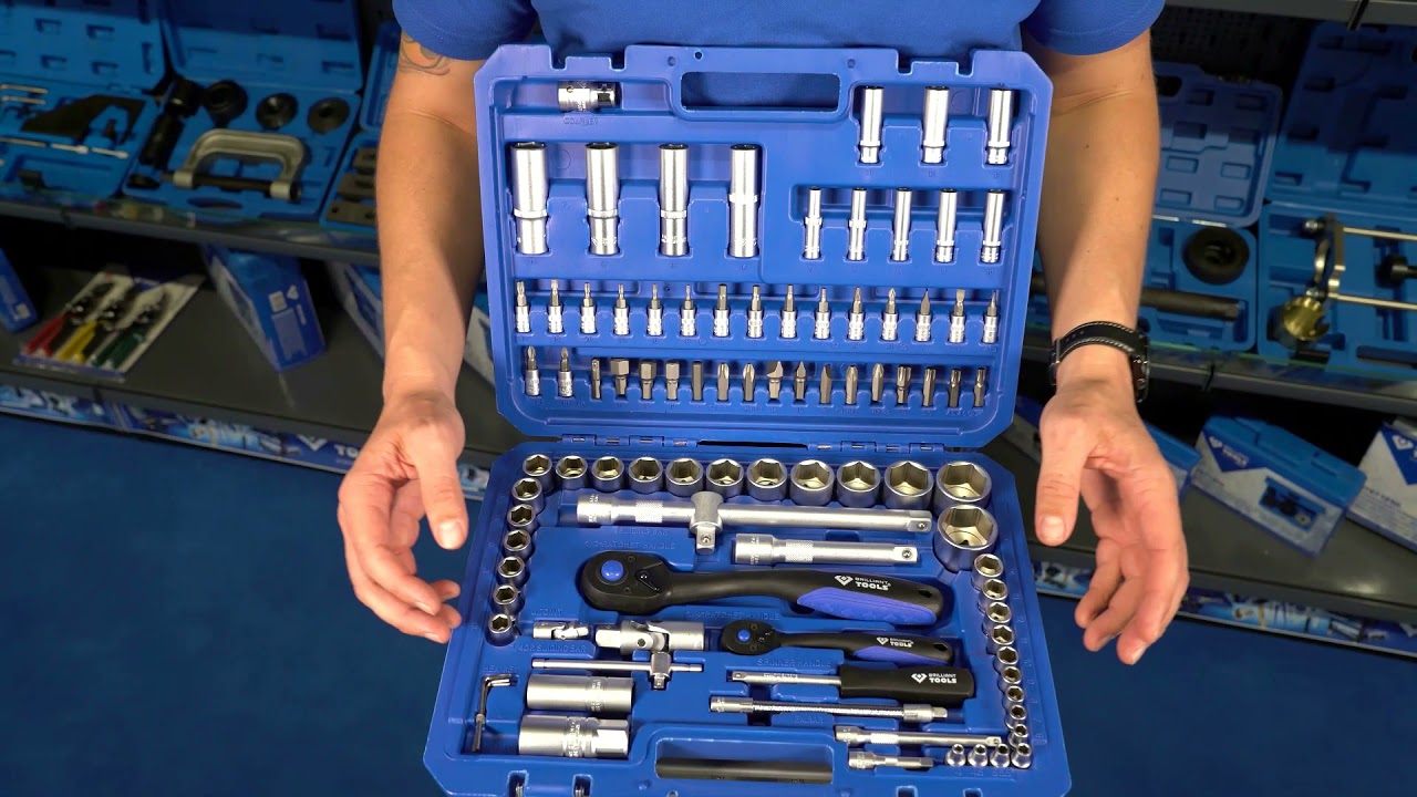 Der 94-teilige BRILLIANT TOOLS Steckschlüssel-Satz BT023094 ist nach DIN gefertigt. Das Set hat einen 1/4" (6,3 mm) und einen 1/2" (12,5 mm) Innenvierkant-Antrieb. Es wird in einem praktischen Koffer mit Metallscharnieren und Verschlüssen mit klemmgesicherten Werkzeugen geliefert. Die Beschriftung im Koffer ermöglicht ein rasches Finden der passenden Einsätze.