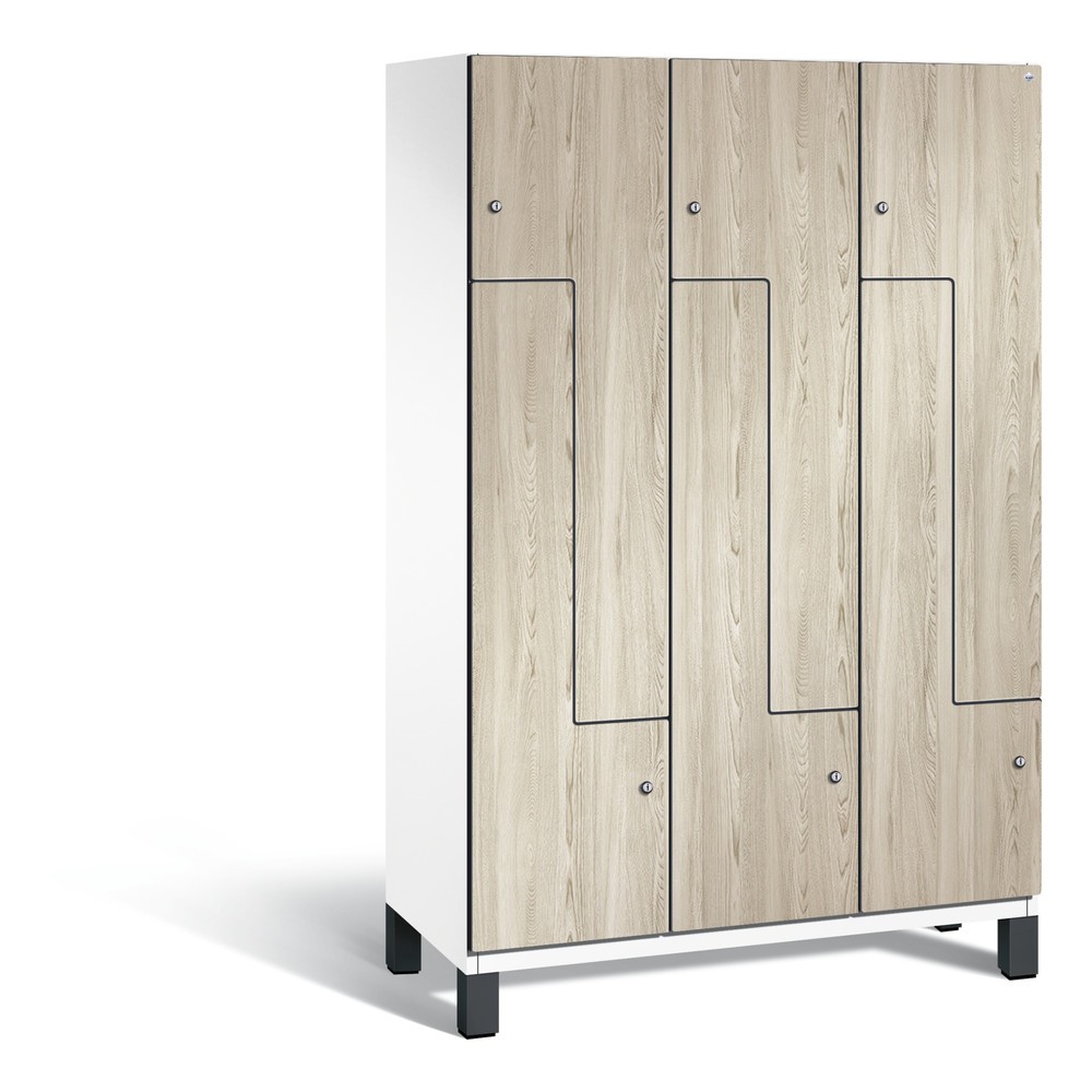 C+P Z-Spind Cambio, 3 Abteile, Abteilbreite 400 mm, HxBxT 1980x1200x525 mm, RAL 9016 Verkehrsweiß, Dekor Sen-Esche, Füße
