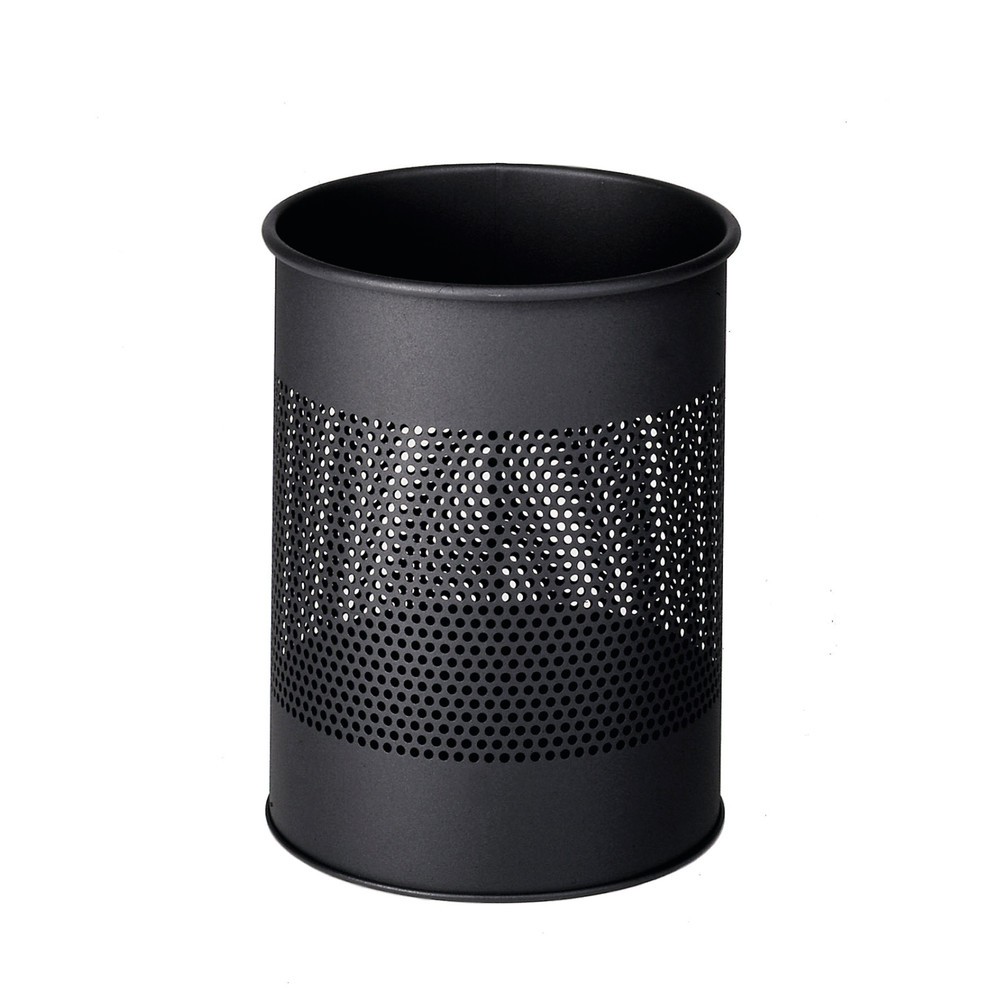 - Papierkorb aus Metall, rund, mit 165 mm breitem, dekorativem Perforationsring, 15 Liter. Aus Stahl mit kratzfester Epoxidharz-Beschichtung. Maße (HxDurchmesser): 315 x 260 mm.